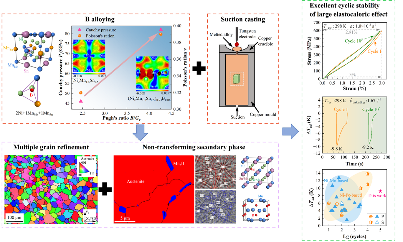 研发出兼具大弹性热效应与优异弹热循环稳定性的Ni-Mn-Sn基形状记忆合金,对于推动固态弹热制冷技术发展至关重要。研究团队首先利用第一性原理计算揭示了微合金化硼(B)原子的优先占位特征,并通过弹性常数与差分电荷密度分析阐明了硼合金化增强合金力学性能的内在机制。研究进一步提出一种有效的微观结构调控策略——将吸铸工艺与硼合金化协同结合,该策略可实现多重晶粒细化并引入非相变第二相。此方法显著改善Ni-Mn-Sn基合金的力学性能与弹热循环稳定性。其中,研究获得的细晶(Ni43.5Mn46Sn10.5)98.5B1.5合金在298K下3%压应变卸载条件下实现了高达9.8K的绝热温变,并在288K至368K的宽温区内保持优异的超弹性与稳定的弹热效应表现。更为突出的是,该合金在600 MPa应力下经10⁵次循环后弹热效应几乎无衰减,其循环稳定性显著优于目前已报道的大多数Ni-Mn基及Ni-Fe基磁致形状记忆合金。这一成果为高性能固态制冷材料的研发提供了新的思路与技术路径。
