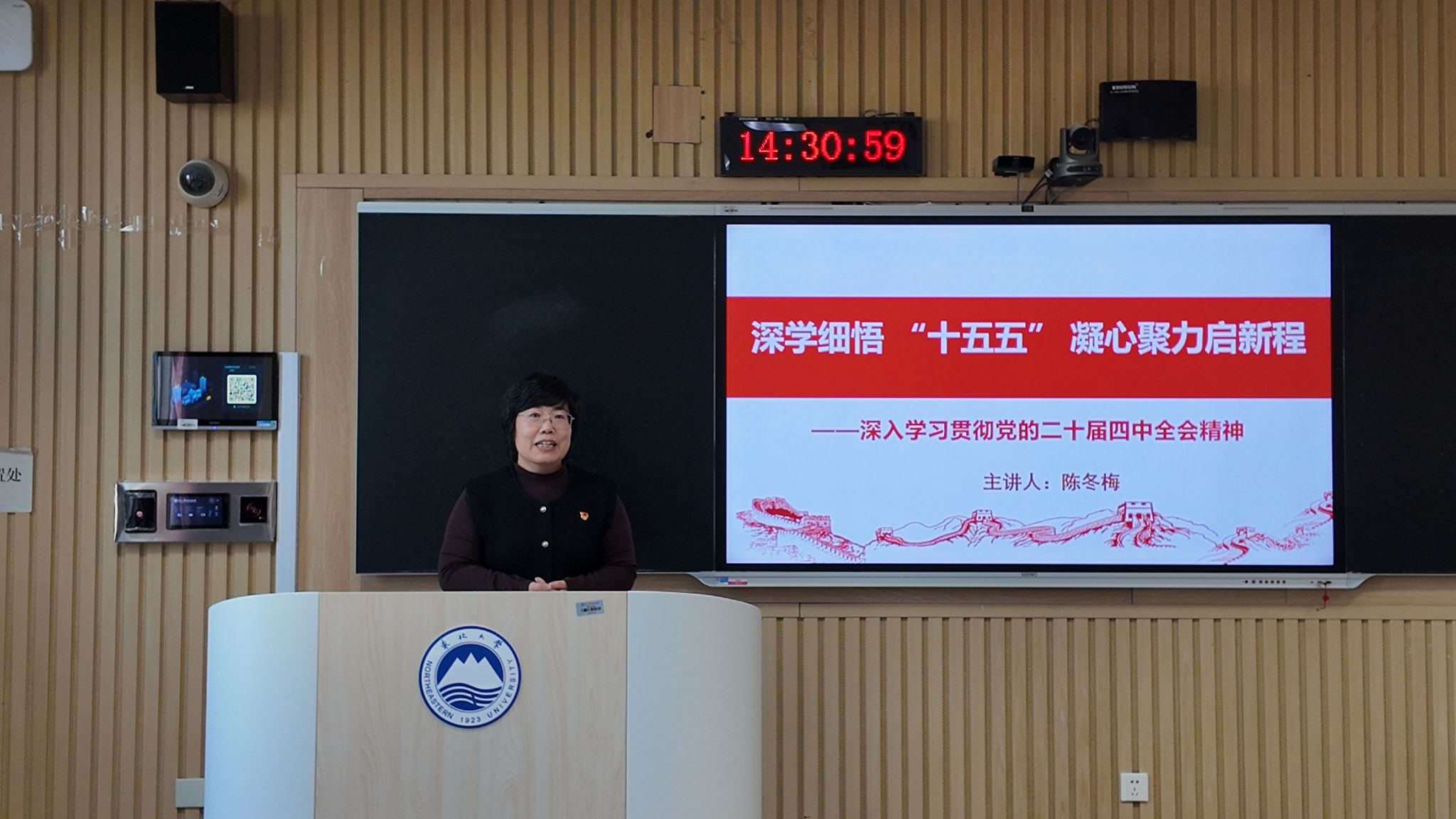 为深入学习贯彻党的二十届四中全会精神,引导全院教职工把思想和行动统一到全会决策部署上来,按照学校党委关于开展专题宣讲工作的统一要求,12月24日,资源与材料学院在G406教室举办党的二十届四中全会精神专题宣讲会。学院全体教职工参会,宣讲会由学院党委书记陈冬梅主讲,以“深学细悟‘十五五’ 凝心聚力启新程——深入学习贯彻党的二十届四中全会精神”为题,系统解读全会精神核心要义与实践要求。